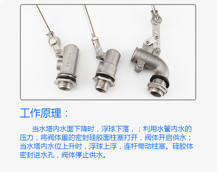 當(dāng)水塔內(nèi)水面下降時(shí),浮球下落,;利用水管內(nèi)水的壓力,將閥體里的密封硅膠面柱塞打開(kāi),閥體開(kāi)啟供水;當(dāng)水塔內(nèi)水位上升時(shí),浮球上浮,連桿帶動(dòng)柱塞。硅膠體密封進(jìn)水孔,閥體停止供水。
