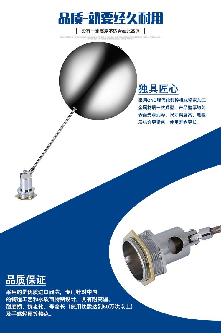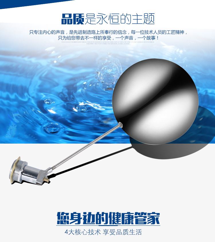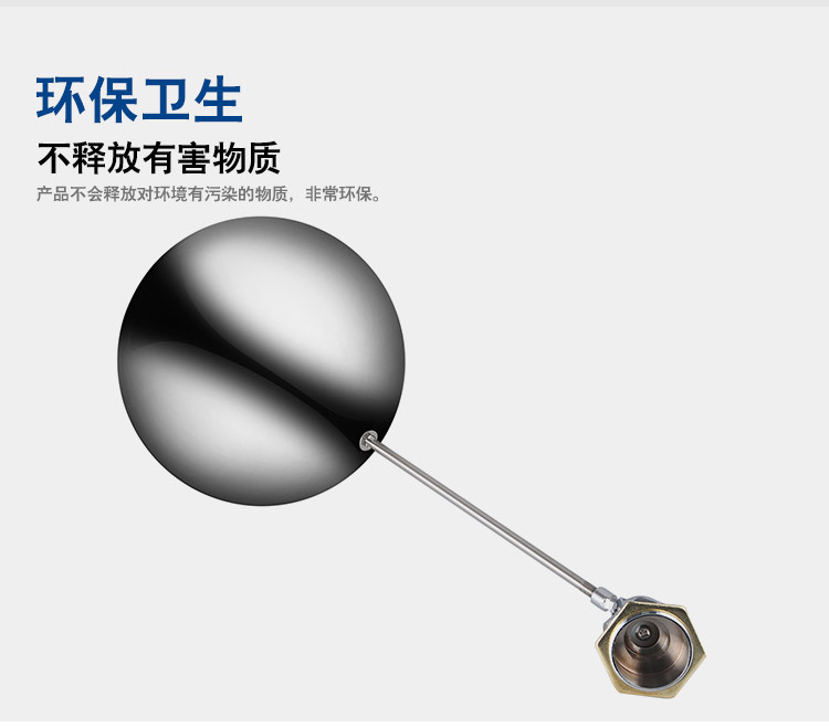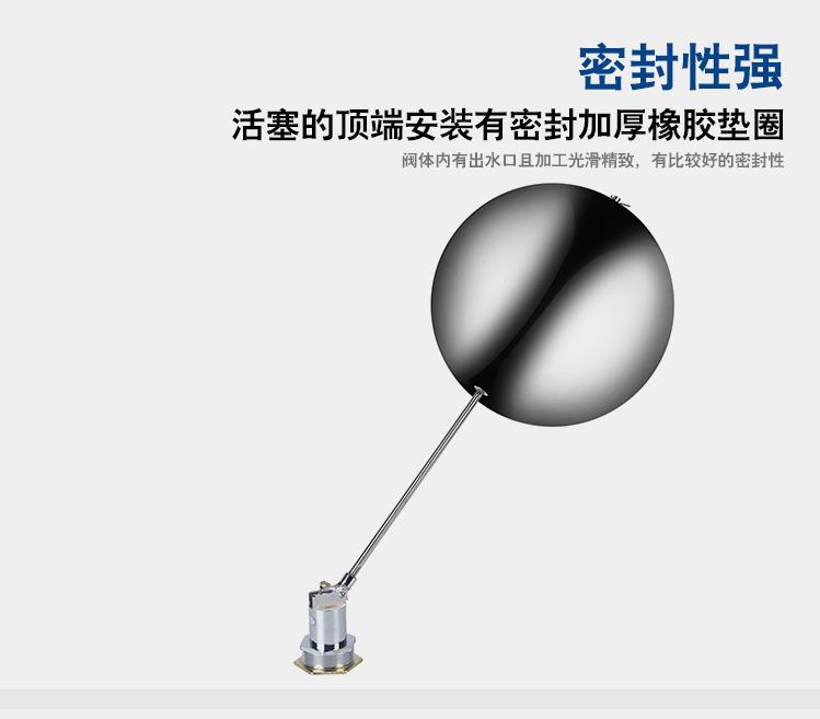當(dāng)水塔內(nèi)水面下降時(shí),浮球下落,利用水管內(nèi)水的壓力,將閥體里的密封硅膠柱塞打開(kāi),閥體開(kāi)啟供水,當(dāng)水塔水位上升時(shí),浮球上浮,連桿帶動(dòng)柱塞,硅膠體密封進(jìn)水孔,閥體停止供水.