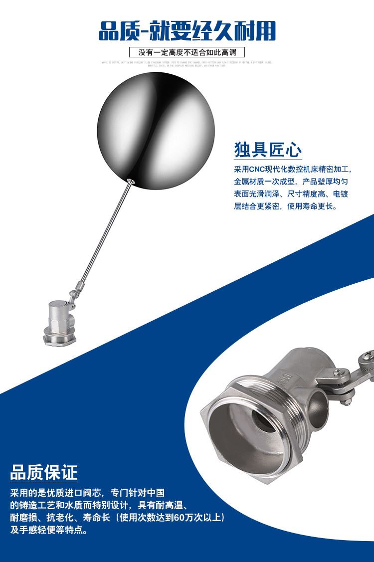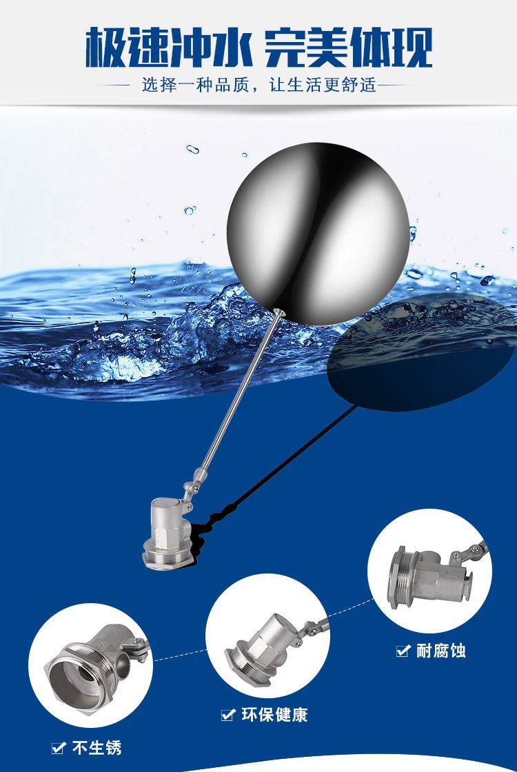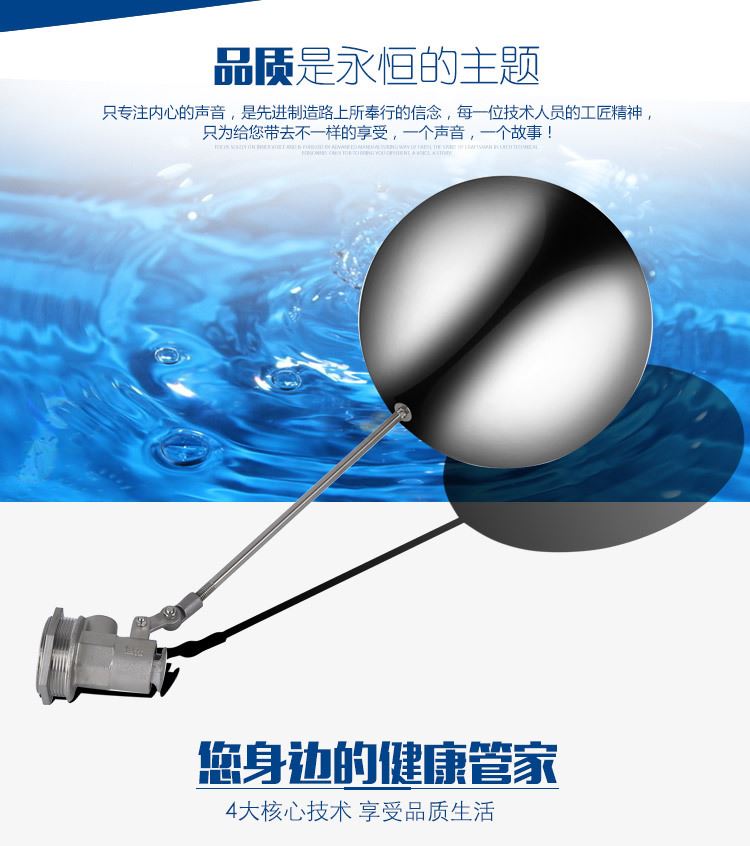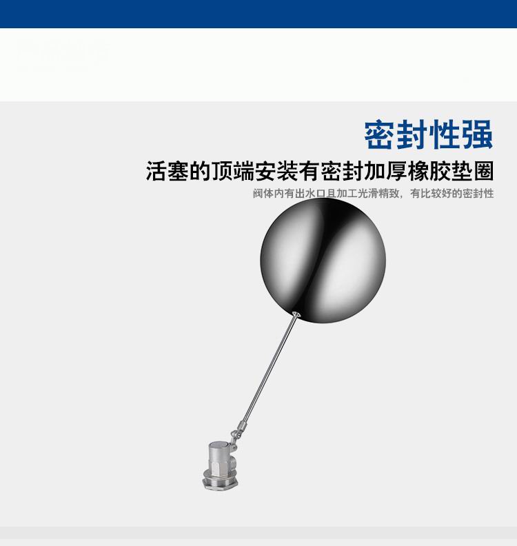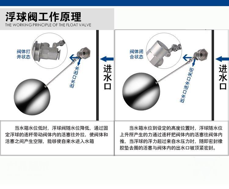 當(dāng)水塔內(nèi)水面下降時,浮球下落,利用水管內(nèi)水的壓力,將閥體里的密封硅膠柱塞打開,閥體開啟供水,當(dāng)水塔水位上升時,浮球上浮,連桿帶動柱塞,硅膠體密封進水孔,閥體停止供水.